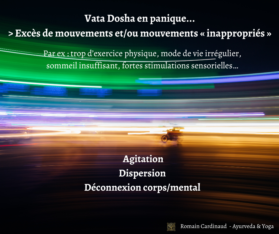 Vata Dosha est relié au principe du mouvement et aura tendance à être déséquilibré par une accumulation excessive de mouvements « inappropriés » ou « inadaptés » (manque ou excès d’exercice physique, irrégularité dans toutes les habitudes de vie, sommeil insuffisant, fortes stimulations sensorielles…). La notion de mouvement se retrouve dans les différents plans de l’individu :