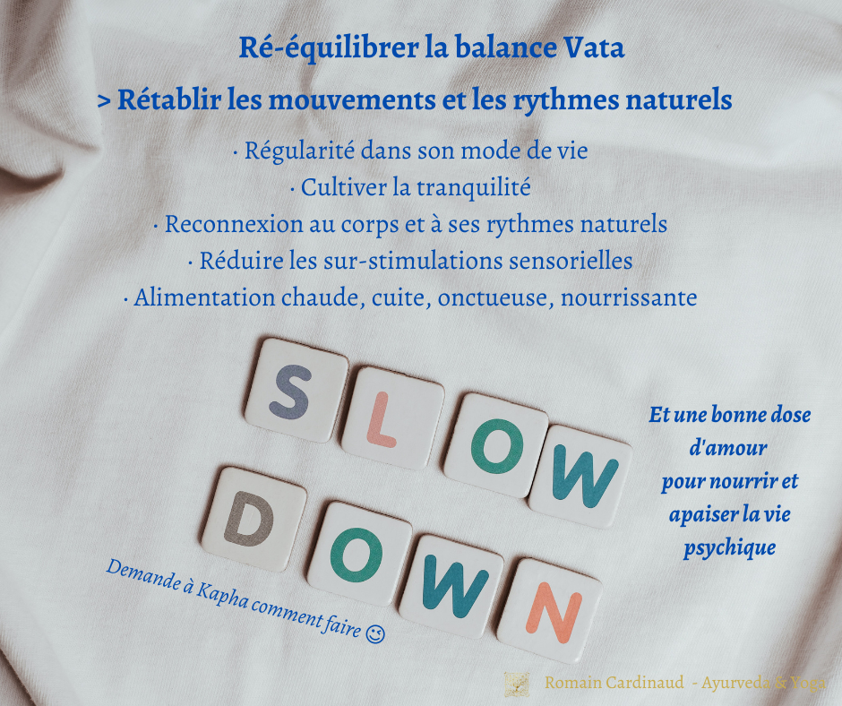 Si l’évaluation de santé d’une personne révèle une situation de déséquilibre du Dosha Vata en excès, l’axe général pour pacifier Vata est d’utiliser le concept des qualités ou attributs (gunas) opposées afin de rétablir l’équilibre.